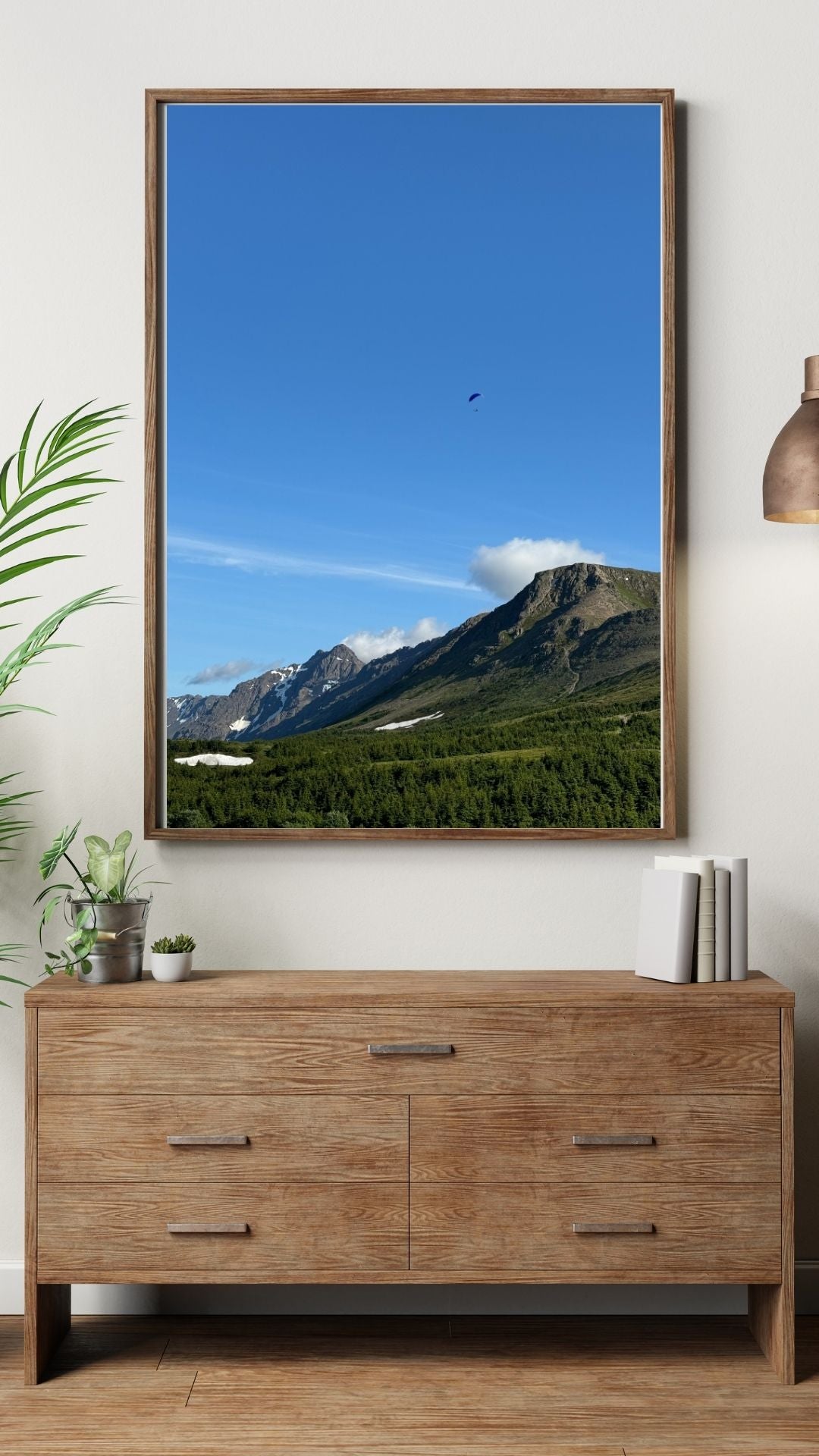Experience the stunning beauty of a parachuter sailing above the mountains in Alaska. The perfect addition to your space or a great gift for that special person in your life.
